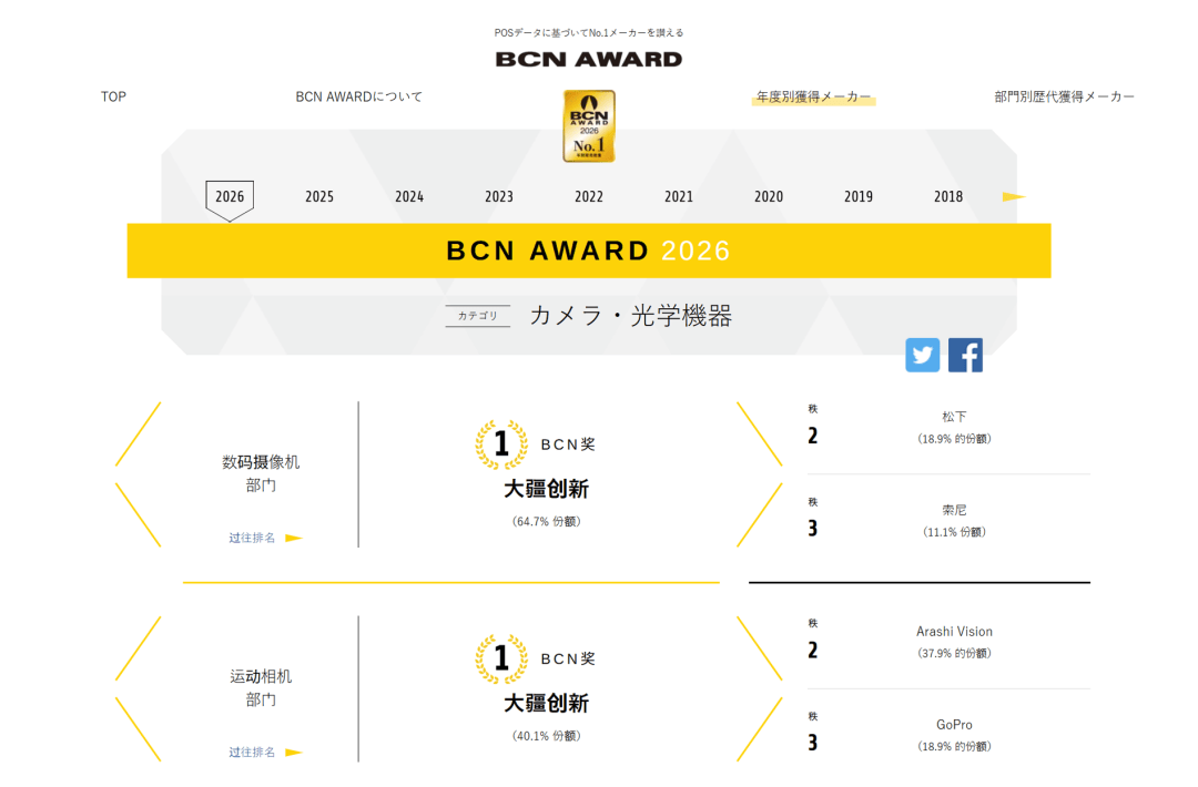 一个例证是,大疆在全球市场强大的统治力。1月19日,日本权威零售分析机构BCN+R向大疆颁发了两大年度奖项“BCN AWARD 2026”,大疆一举包揽“数码摄像机”与“运动相机”两大品类年度销量冠军。