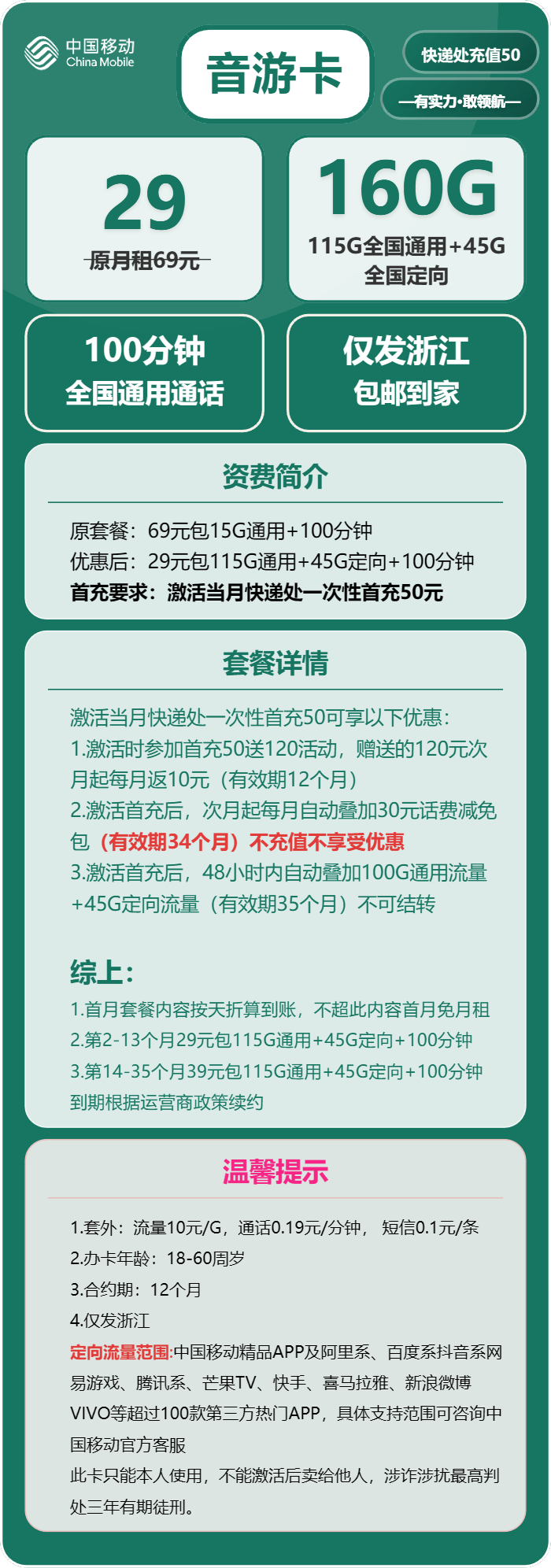 如果你是浙江用户,且符合“长期使用(≥1年)、流量需求大(≥50G/月)、能接受快递活”,这款移动音游卡