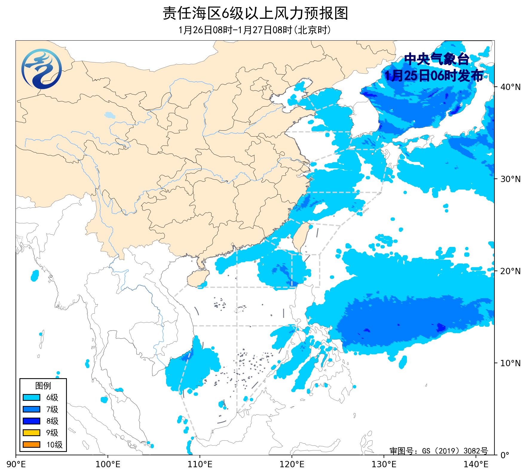 26日08时至27日08时,东海南部海域将有4~5级增大到6~7级、阵风8级的偏北风,渤海海峡、黄海北部和中部海域将有4~6级、阵风7级的偏北到西北风,东海北部海域、南海西南部海域将有4~6级、阵风7级的偏北到东北风,巴士海峡、南海东北部海域将有5~6级、阵风7级的偏东到东北风。