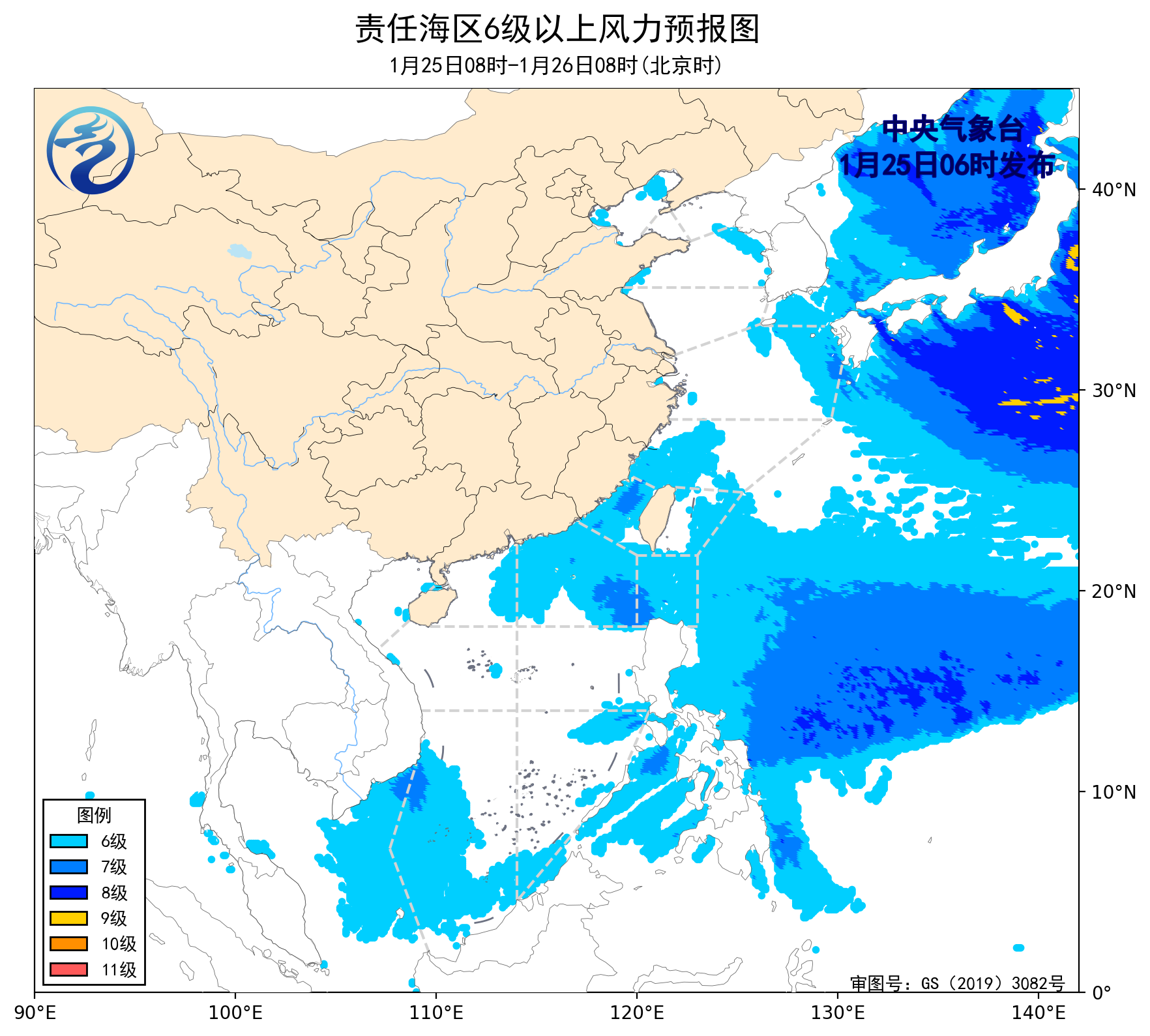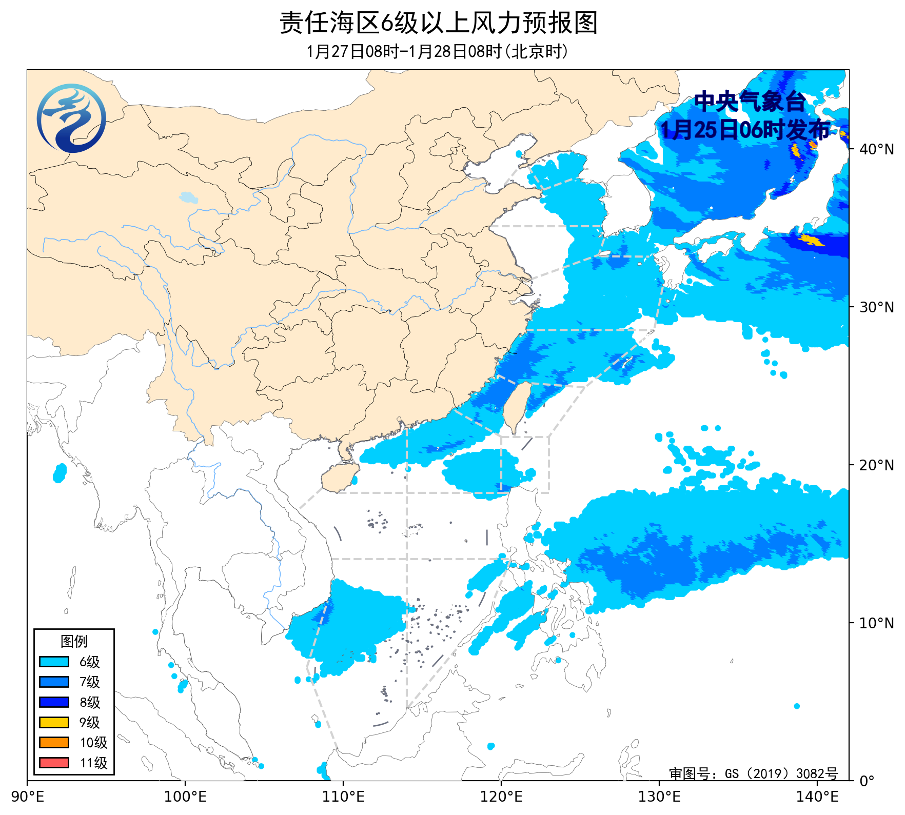 24日08时至25日08时,东海北部海域将有5~7级、阵风8级的西北风,南海西南部海域将有6~7级、阵风8级的东北风,黄海大部海域将有4~6级、阵风7级的偏北到西北风,台湾海峡、南海中部和东南部海域将有5~6级、阵风7级的偏北到东北风,东海南部海域、台湾以东洋面、巴士海峡、南海东北部海域将有5~6级、阵风7级的偏东到东北风。